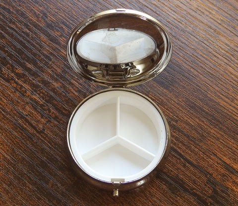 High quality metal pill box, with three interior compartments. Sized at just 50mm x 15mm, these are really sweet (and practical) little containers!