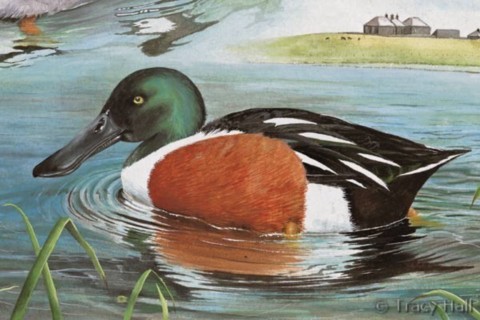 Reproduced from the original illustrations by Tracy Hall for The Orkney Book of Birds. This plate features Mallards on the Boardhouse Burn, Birsay, Pintails on the Loch of Banks, Birsay and Shovellers on the Loch of Lythes, South Rondalsay.